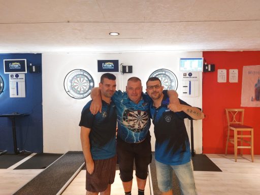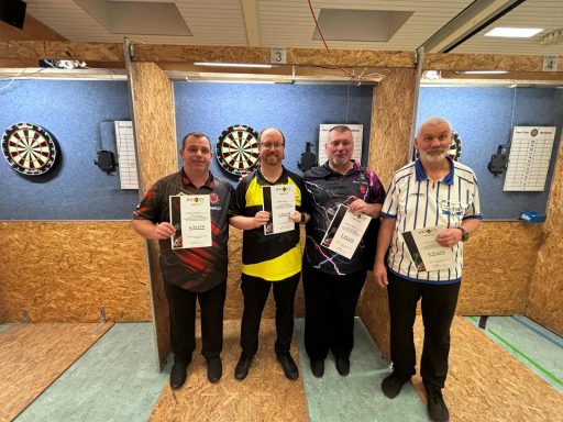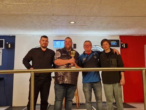 Ian überreicht Kristijan den Mannheim United Vereinspokal. Im starken Finale gegen Eule traf Kristijan am Ende den letzten Dart ins Doppel